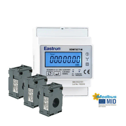 Bundle: SDM630MCTE-MID & 3x T24 Split Core Current TransformersIf you require a higher CT ratio please get in touch with us on 01268 773 766 PRODUCT FEATURES: MID B&D Approved - 0120/SGS0150 Single Phase (1P2W) or Three Phase (3P4W) Multifunction Meter (16 different parameters) CT Operated (1A or 5A secondary - settable) 230/400V AC RS485 Modbus RTU Dual...